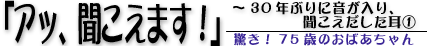| 「5日前から右耳がまったく聞こえなくなりました。それまでは、近くで大きい声を出せば聞こえていたのに」 75歳の母親の手を引きながら、困ったような顔をして診察室に女性が入ってきました。ずっと寝たきりなのに、耳も全然聞こえなくなったとのことで心配そうです。 「左耳は30年前に手術をしていてまったく聞こえません。右耳はわずかに聞こえていましたが、5日前からまったく聞こえなくなったのです。障害手帳も持っています。2級だったと思います」 左耳は手術の跡がありますが、鼓膜はきれいに再生しています。右耳は耳垢が充満し、血液もみられます。どうも何かで耳を触り、外耳道を傷つけたようです。丁寧に、充満している血の混ざった耳垢を取ってゆきましたが、鼓膜の上にある耳垢はこびり付いて取れません。外耳道からの出血もあり、これ以上は処置を続けるのは無理です。 「耳垢が多く、全部は取れませんので、また明日来て下さい。障害者手帳も持って来て下さい」 耳に点耳液を差したあとガーゼを挿入して、とりあえず翌日診ることにしました。 次の日、ガーゼを外すと、頑固に付着していた耳垢も取れ、外耳道からの出血も止まっていました。 「どうです、聞こえますか?」 「ハイ、少しは聞こえます」 笑顔で答えてくれました。しかし、耳をよく見ると何か変です。鼓膜が曇ってみえます。どうも鼓膜の裏に滲出液が溜まっているようです。中耳炎だったのかなと思いながら、鼓膜切開をしてみました。溜まっていた液を出したあと、 「聞こえますか、どうですか?」 「アッ、聞こえます。よく聞こえます」 と、大変びっくりしたような笑顔で答えます。付き添いの人も驚いています。普通の大きさの声で聞こえるようになったのです。 障害者手帳を見せてもらうと、右80dB、左90dBで3級の障害になっています。 「変だナ、これは多分40dBはありますヨ」 不思議に思い、聴力検査をすると、右は50dBです。これでは、障害者としては6級がやっとです。長い間、中耳腔に分泌液を溜めたまま、聞こえないと思っていたのです。30年以前の障害者認定ですから、十分に耳の診察も受けていなかったのかもしれません。 一般に滲出性中耳炎になると、程度の強い人で40〜50dBまで聴力が落ちることがあります。この人は、もともと聴力が弱かった上に滲出性中耳炎となり、80dBの聴力の低下となっていたのでしょう。今の治療なら鼓膜を切開し、鼓膜に換気用の小さいチューブを留置すれば、たちまち聴力は改善します。この方も、チューブを挿入し、通気をしばらく続けて、日常会話ができるまでに聴力を改善させることができました。30年ぶりの聞こえです。 耳が聞こえない人で、滲出性中耳炎になっている人は多いものです。しばらく放って置いている方は、念のため、一度耳を診てもらうことを勧めます。 (1997年2月)