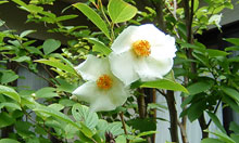 白い花が次々に咲いては散っていきます。ヒメシャラよりは大きい花です。その名はナツツバキ。別名シャラノキ。釈迦の入滅に際して白く色を変えた沙羅樹と間違われてシャラノキと呼ばれているそうです。梅雨時に咲く椿という意味で梅雨椿とも呼ばれる。雨に打たれハラハラと落ちる花弁に風情を感じます。