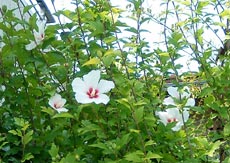 夏の花、ムクゲ。色々な種類がありますが、もっとも品のある、清々しい花は宗旦木槿(そうたんむくげ)。花のそこが紅なので、底紅(そこべに)ともよばれます。万葉時代の朝顔は、この底紅であったと言う説もあります。冬の椿とならんで、代表的な茶花。
