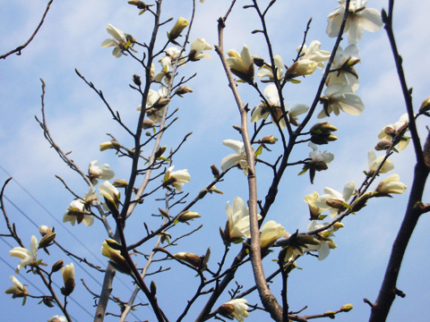 春の嵐が吹き抜けたあとに庭に出てみると、辛夷(こぶし)の花が咲き始めていました。